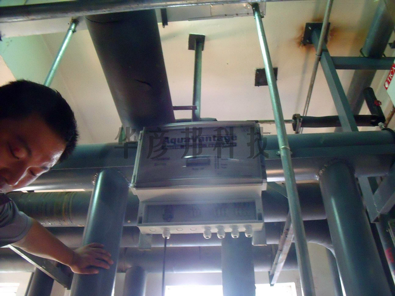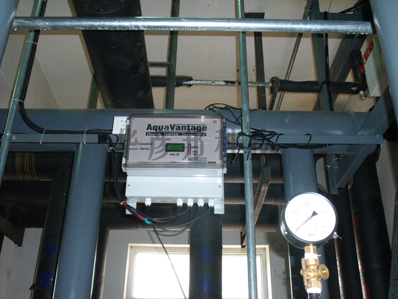 某飛機(jī)維修公司于2012年7月安裝凈元廣譜感應(yīng)水處理器一臺(tái)。該設(shè)備的一組線圈安裝在循環(huán)水系統(tǒng)換熱器前的進(jìn)水管道上,另一組線圈安裝在換熱器后的回水管道上,安裝后運(yùn)行穩(wěn)定。