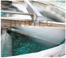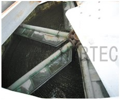 工況概述 某鋁廠80萬噸氧化鋁于2005年9月投產(chǎn),其中的石灰燒制循環(huán)冷卻水和空壓站循環(huán)冷卻水都未采取任何阻垢抑菌處理。空壓站循環(huán)冷卻水供水管外徑273mm,循環(huán)水流量95T/h,系統(tǒng)保有水量250m3,循環(huán)水總硬度360mg/L,該冷卻水供給4臺空壓機(jī)使用。 實(shí)施方案 2006年6月3日在空壓站循環(huán)冷卻水273mm供水管上安裝了一套凈元廣譜感應(yīng)水處理器。 效果評價 2007年2月12日分別觀察了石灰燒制冷卻塔和空壓站冷卻塔,發(fā)現(xiàn)空壓站冷卻塔填料表面很干凈(見圖C);而石灰燒制冷卻塔填料被黑垢附著,已經(jīng)看不清填料顏色(見圖B)。2006年5月打開空壓機(jī)冷卻器,發(fā)現(xiàn)冷卻管內(nèi)有1mm左右的硬垢。2006年6月3日安裝了凈元,運(yùn)行11個月后,在07年5月1日再次打開了空壓機(jī)冷卻器,發(fā)現(xiàn)冷卻管內(nèi)沒有硬垢,只有一層薄薄的黑色淤泥,輕輕一擦既被去除(見圖A)。 |